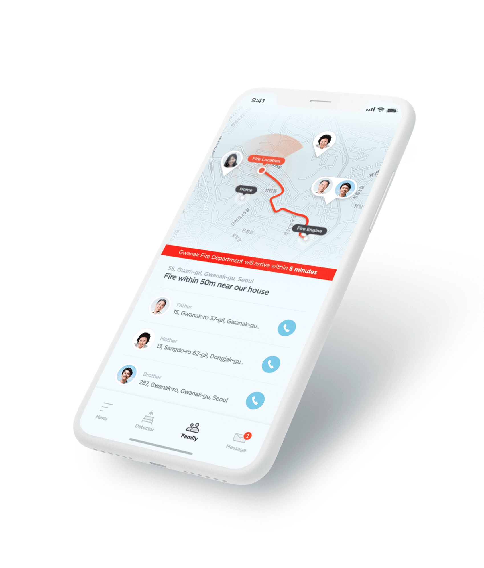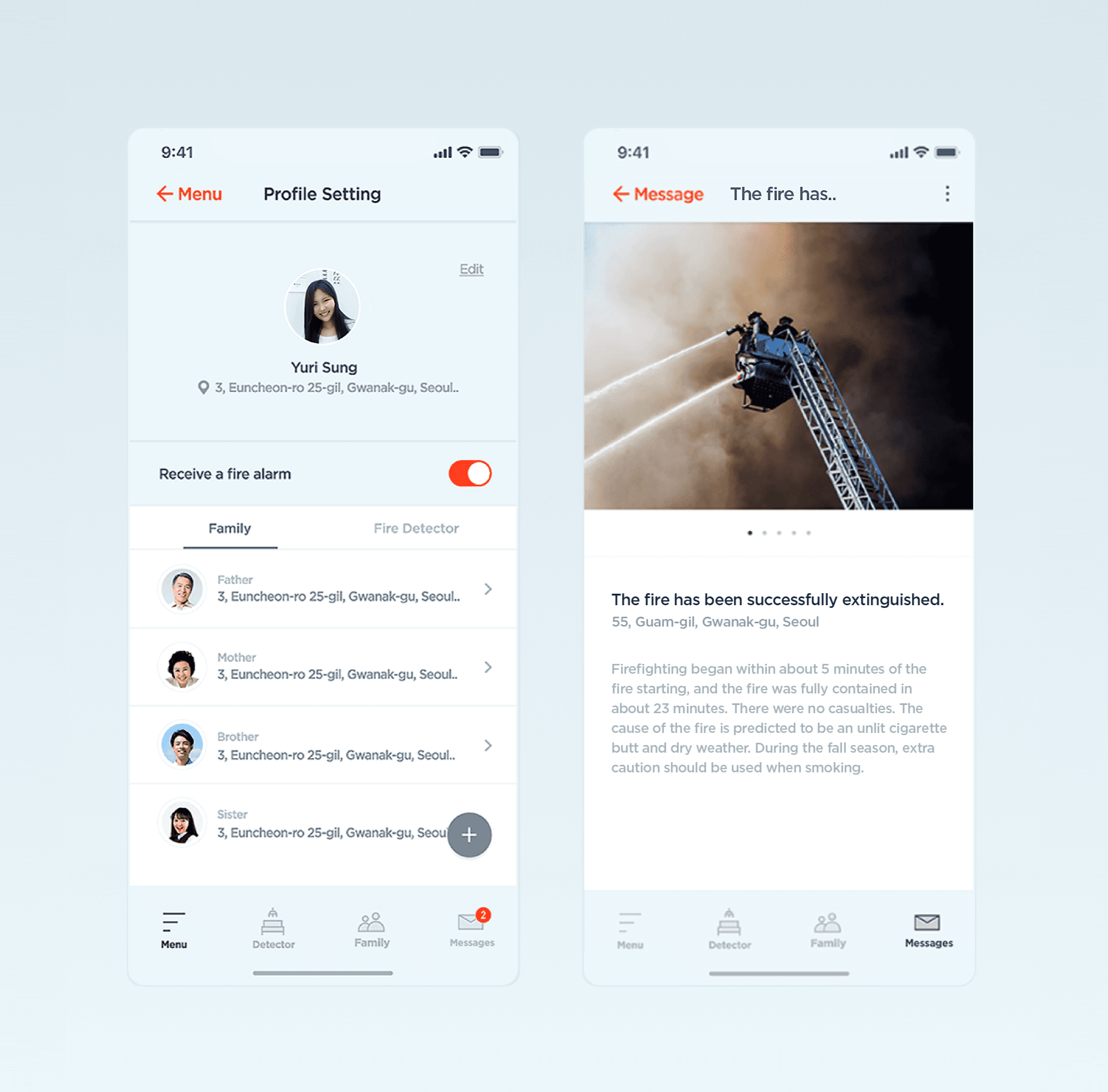 Fire Detector is an integrated fire response system that connects fire detection devices, the Fire Department, and a mobile application to support fast and informed user action during fire emergencies. When a fire breaks out, the detector instantly alerts emergency services and notifies users through the app. Users can then check the fire’s location, monitor their family’s safety, and track the real-time dispatch of fire trucks. After the incident, the Fire Department shares an in-depth analysis via the app, including the fire’s cause, damage reports, and safety recommendations, helping both victims and nearby residents stay informed and better prepared for the future.