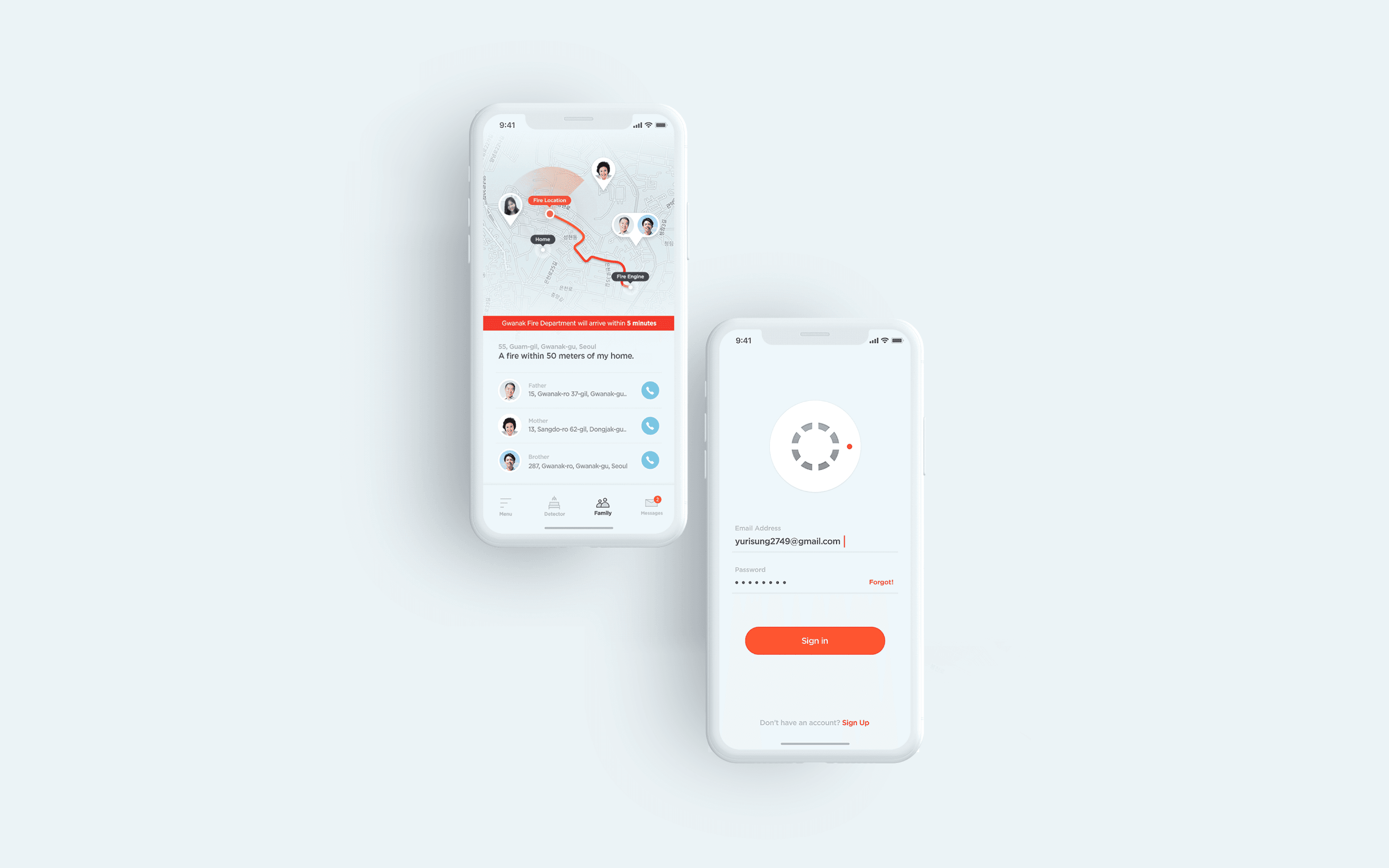 Although fires are infrequent, their impact is often life-threatening and time-sensitive. To design UX that truly supports people during such high-stress situations, user interviews were conducted with individuals who currently use or have used fire detection in their homes. These revealed that users’ top concerns during a fire are the safety and real-time location of their family members, along with clear visibility into the response process. Based on these insights, the app was structured to deliver essential information at every stage from detection to dispatch, and post-incident reports. Each feature was designed to reduce uncertainty and provide timely, actionable updates, enhancing both trust and preparedness.