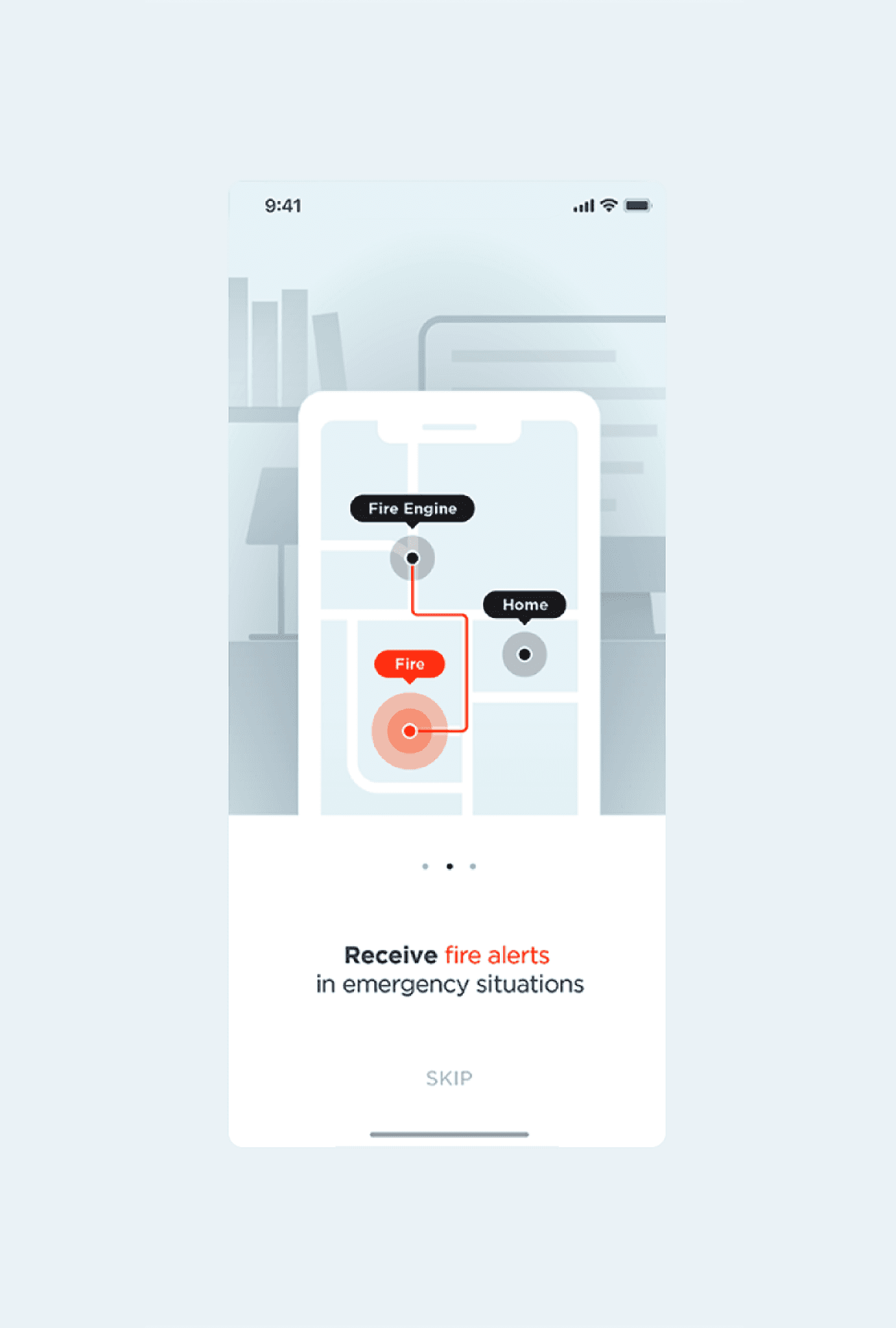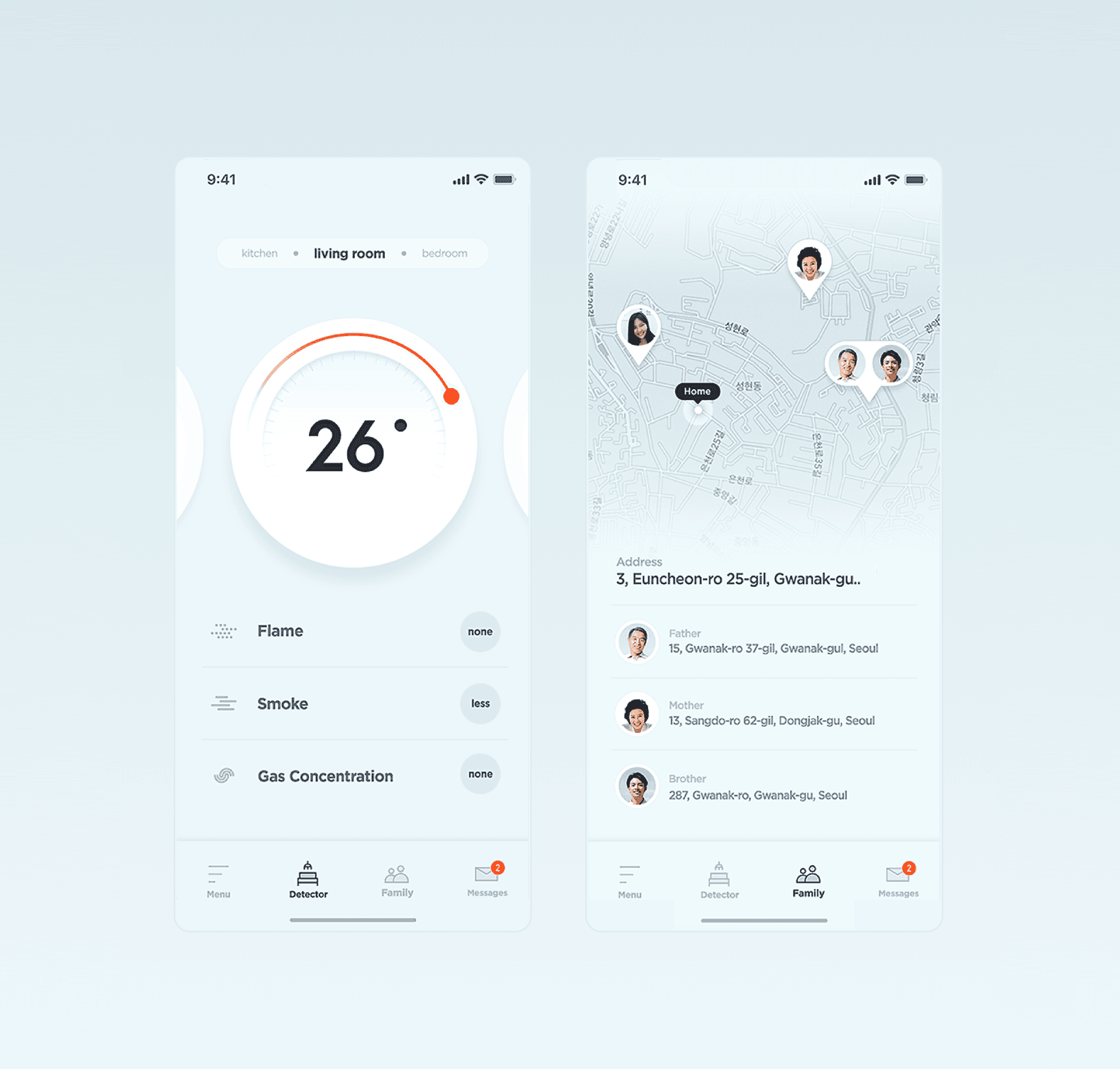 To support rapid decision-making during emergencies, the interface design focuses on clarity, urgency, and minimal distraction. At the onset of a fire, non-essential information is suppressed to highlight what matters most: the occurrence of the fire and the user’s family location, shown clearly on a map for immediate recognition. The visual system is context-sensitive. In a normal state, the interface uses neutral and calming colors to reduce tension and maintain a sense of control. When a fire is detected, the palette shifts immediately to warning red to signal danger and guide user attention. This contrast not only improves usability in high-stress situations but also creates a consistent visual rhythm between normalcy and emergency.